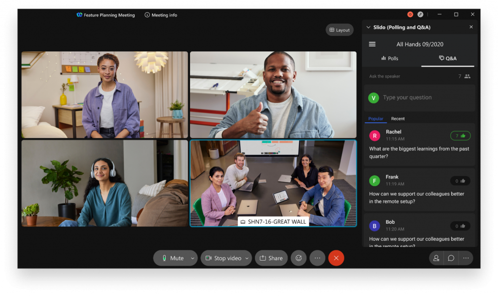 Recientemente completamos la adquisición de Slido y estamos emocionado sde compartir que la tecnología pronto se integrará de forma nativa dentro de la aplicación Webex. Slido agrega la flexibilidad para interactuar con los participantes de la reunión de maneras más significativas. Webex es la primera plataforma de colaboración que integra completamente la mejor tecnología de participación de la audiencia de Slido para crear experiencias de reunión más inclusivas e interactivas.