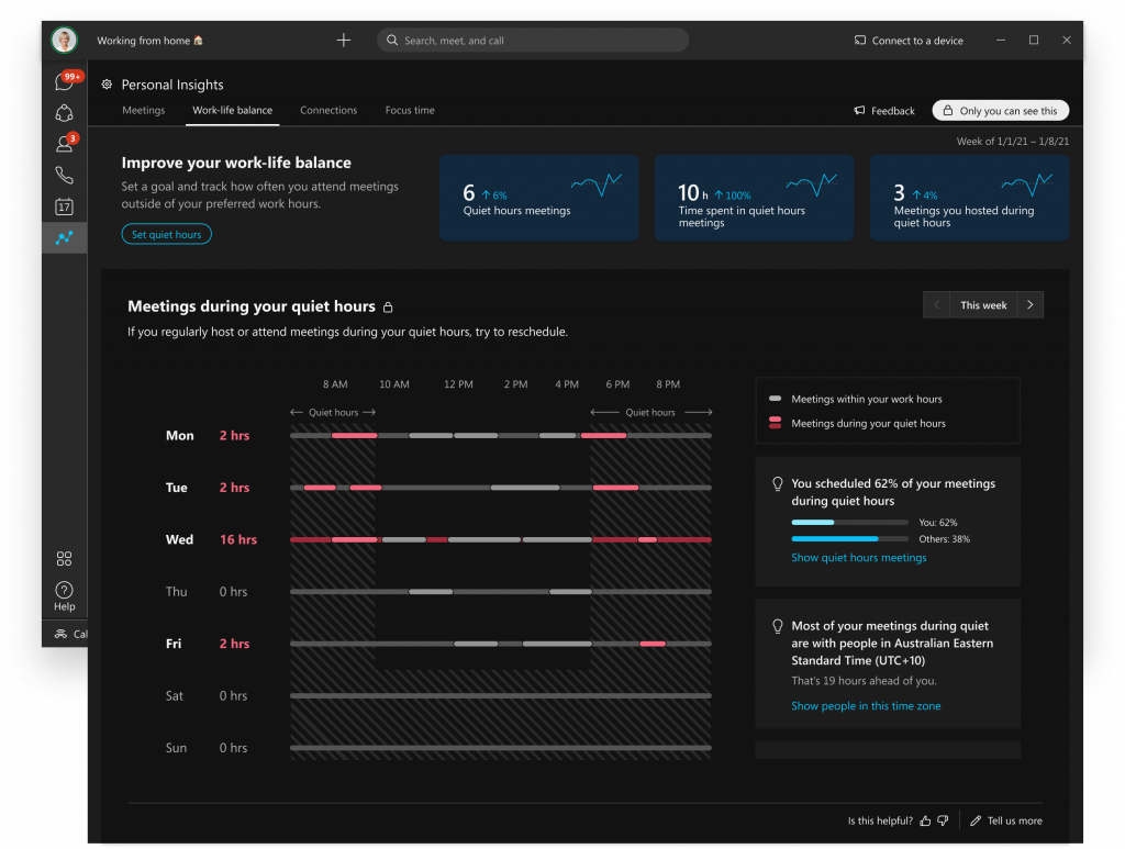A principios de este año, introdujimos una nueva innovación en el mercado llamada People Insights. Esta valiosa funcionalidad proporciona datos en tiempo real que son privados para cada individuo y muestra tendencias que pueden permitirnos ser más inteligentes y tomar decisiones informadas sobre cómo gastamos nuestro tiempo. Hoy estamos mejorando esta capacidad con la introducción de conocimientos personales, que les brinda a las personas la capacidad de establecer objetivos personales y ver el progreso en tiempo real frente a ellos, todo dentro de Webex Suite. Como siempre, solo cada individuo puede acceder a los datos de información personal.