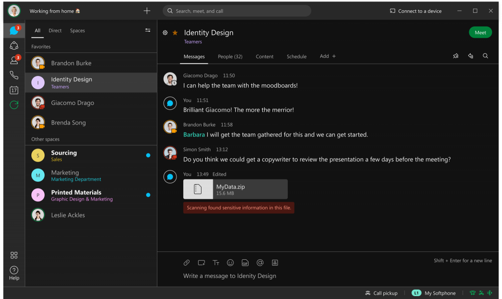 También presentamos la primera capacidad de prevención de pérdida de datos (DLP) en tiempo real de la industria. Con DLP en tiempo real, puede prohibir que se envíe contenido clasificado, en lugar de redactar o eliminar contenido después de su publicación. Este es solo otro ejemplo de cómo se entregan las soluciones de Webex con nuestra mejor seguridad integrada para mantener su organización segura desde el principio.