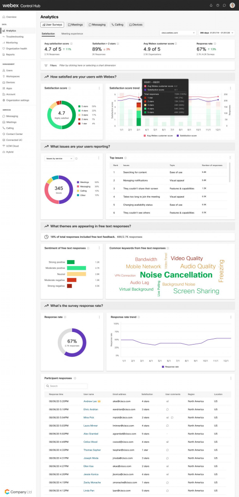 Y dado que los comentarios directos son más importantes que nunca en el lugar de trabajo híbrido, estamos desarrollando nuevas encuestas de satisfacción del usuario que se centralizarán en Control Hub, lo que permitirá a los administradores escuchar la voz de sus usuarios y recibir comentarios de Webex, todo en un solo lugar.