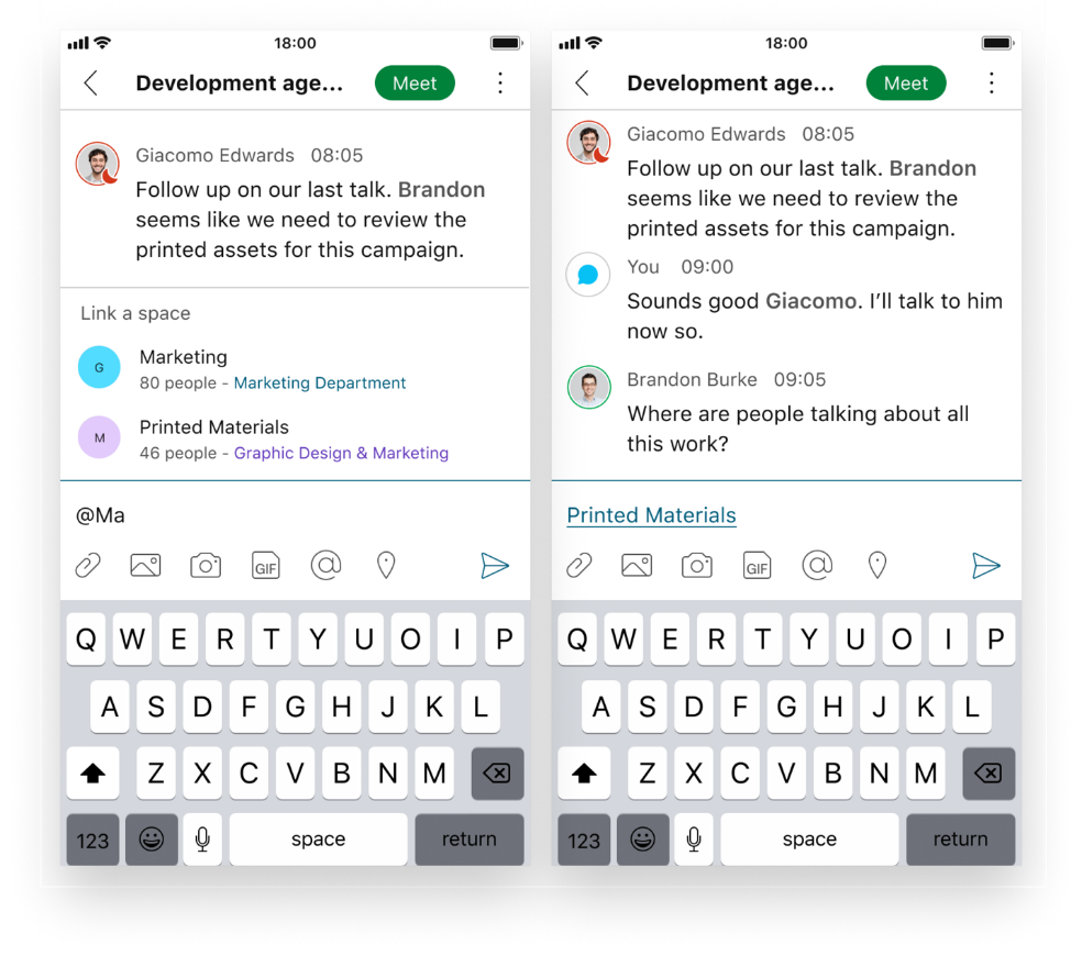 Reúna a las personas adecuadas en los espacios adecuados sobre la marcha mediante enlaces de espacio en el móvil. Vincula rápidamente un espacio @mencionándolo en el área de redacción. También puede copiar un enlace para compartir presionando prolongadamente el menú en la lista de espacios o mediante la configuración en el espacio.