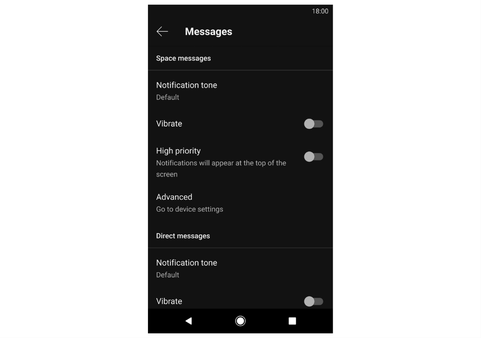 Reconozca mensajes a partir del sonido y la vibración de su teléfono. Los usuarios de Android ahora pueden personalizar los sonidos de notificación en sus dispositivos móviles. Los usuarios pueden establecer sonidos de notificación separados para diferentes tipos de mensajes, específicamente para mensajes directos y espacios grupales. Las opciones de sonido son nativas de Android y las vibraciones se pueden activar o desactivar para cada tipo de mensaje.