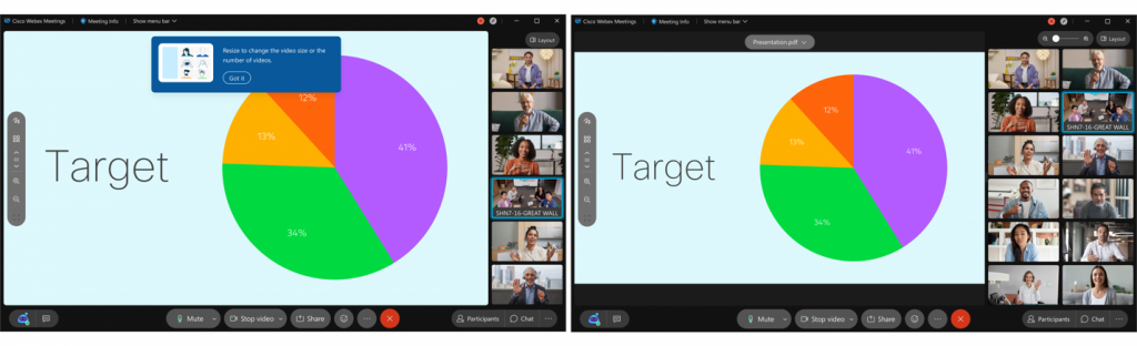 Cuando organice o participe en una reunión, puede tirar de la tira de película hacia abajo en «Vista de pila» o hacia la izquierda en «Vista de lado a lado» para mostrar otra fila de videos de los participantes. De esta manera, puede ver las reacciones de más personas que son importantes para usted durante la presentación.