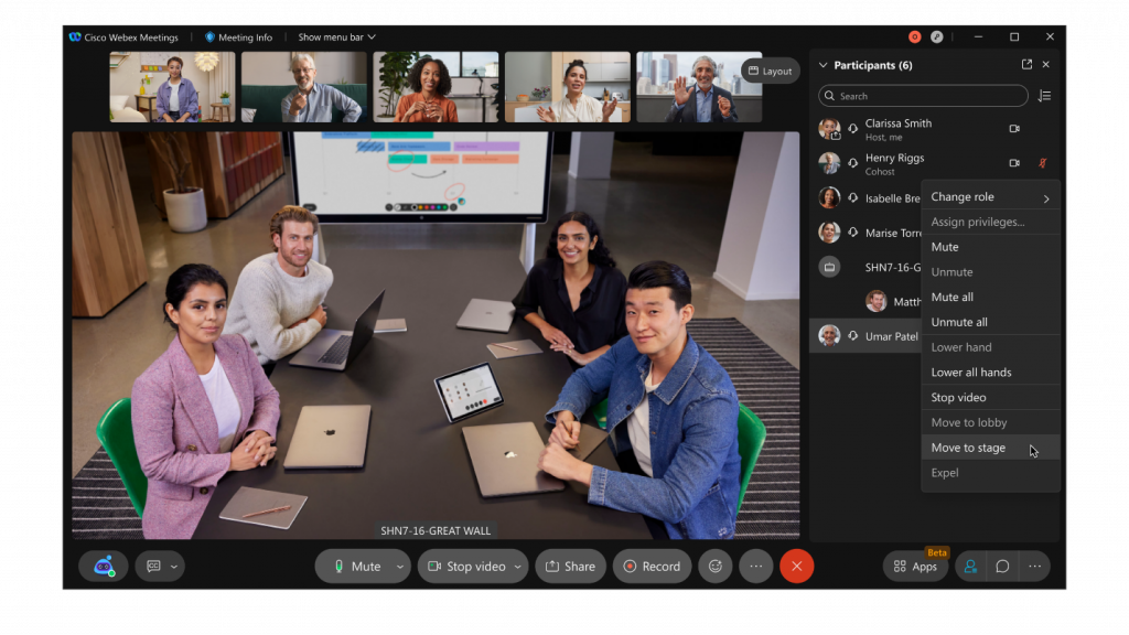 Ya puede arrastrar y soltar participantes a la vista del escenario. Ahora también puede mover cualquier participante al escenario desde el panel Participantes. Simplemente haga clic con el botón derecho en un participante y seleccione Mover al escenario.